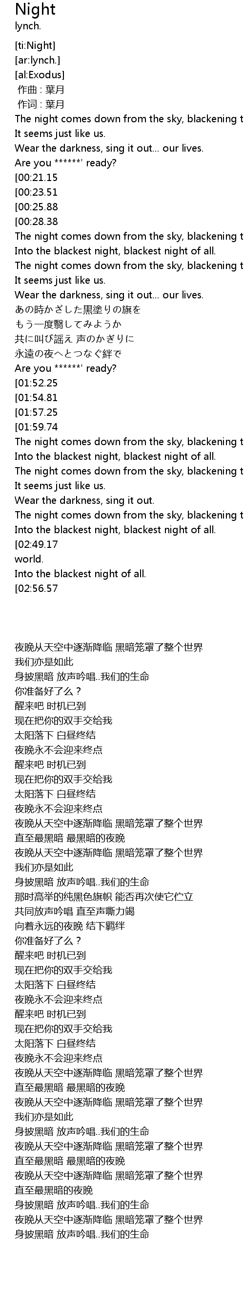 | [02:29.46] | The night comes down from the sky, blackening this whole world. |