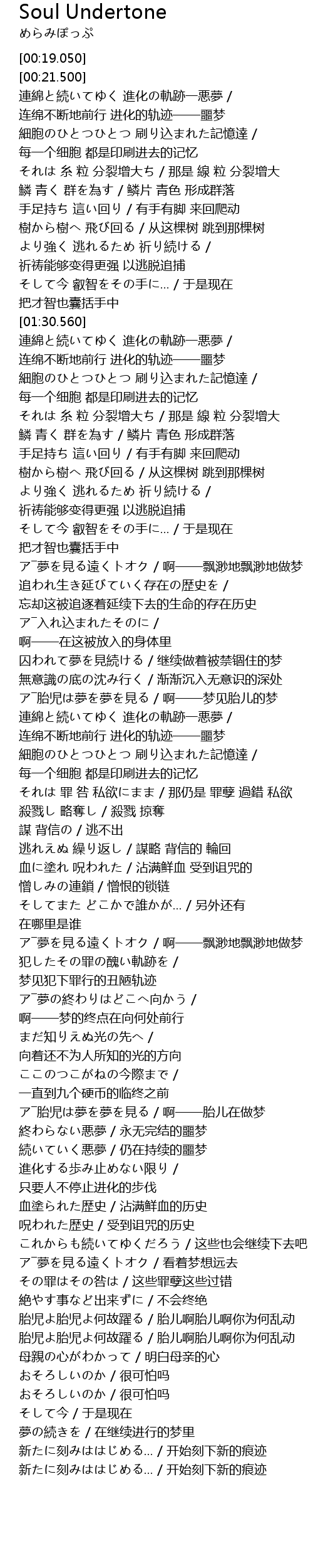 | [03:23.720] | 連綿と続いてゆく 進化の軌跡一悪夢 / 连绵不断地前行 进化的轨迹——噩梦 |