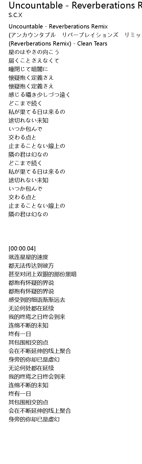 | [00:00.04] | Uncountable - Reverberations Remix (アンカウンタブル リバーブレイションズ リミックス) (Reverberations Remix) - Clean Tears |