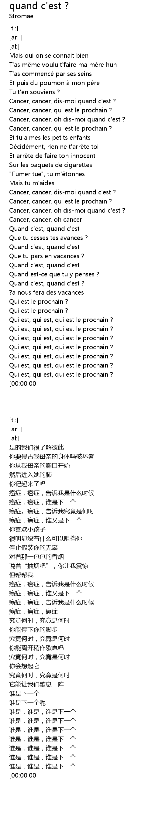 | [00:40.21] | Cancer, cancer, oh dis-moi quand c'est ? |