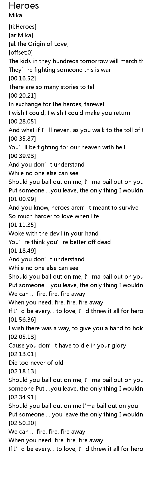 | [02:59.37] | If I’d be every… to love, I’d threw it all for heroes fallen. |