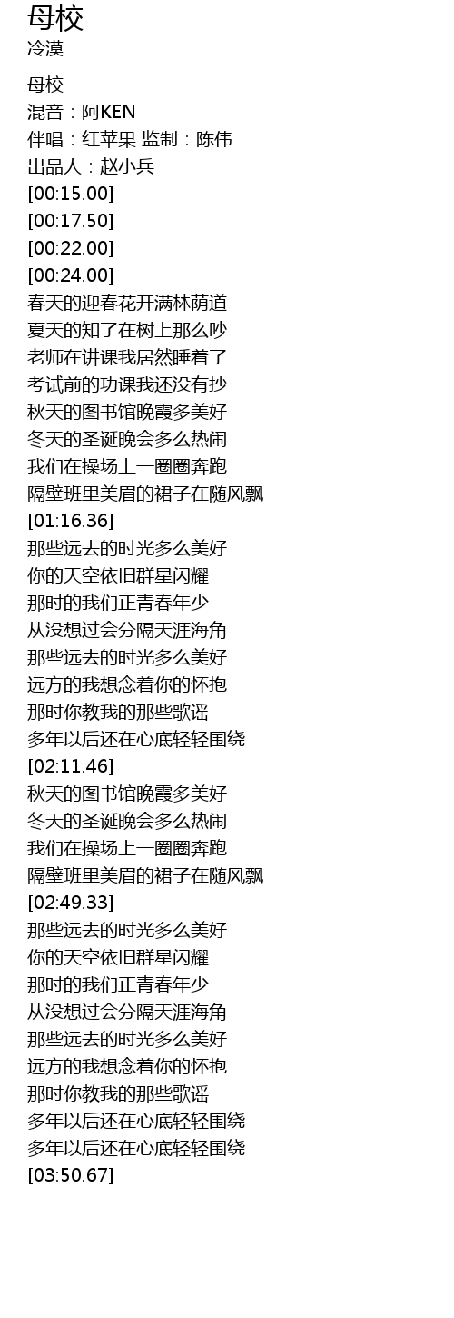 | [00:11.00] | 伴唱:红苹果 监制:陈伟 |