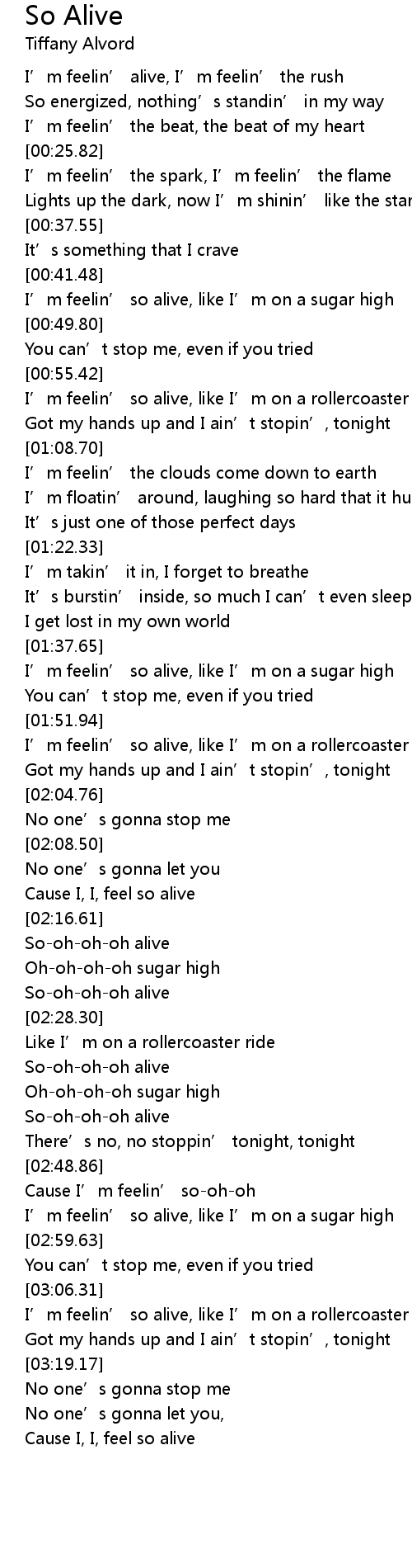| [02:53.88] | I' m feelin' so alive, like I' m on a sugar high |