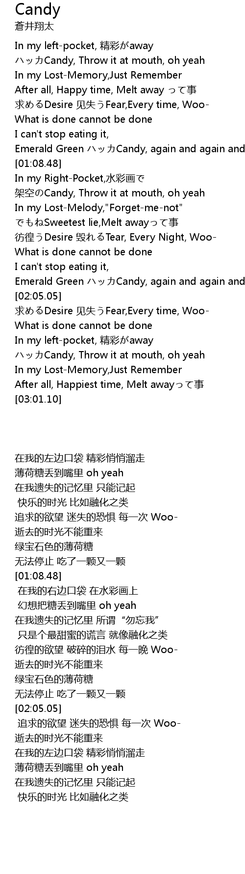 | [00:59.22] | Emerald Green Candy, again and again and again... |