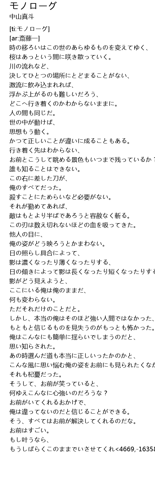 | [01:12.256] | 俺の姿がどう映ろうとかまわない。 |