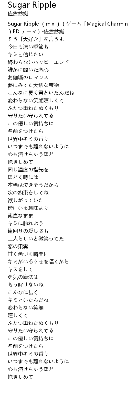 | [00:00.00] | Sugar Ripple (mix )(ゲーム「Magical Charming !」(of Sugar )ED テーマ)-佐倉紗織 |