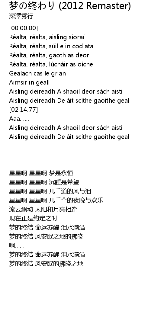 | [00:12.23] | Réalta, réalta, aisling síoraí |