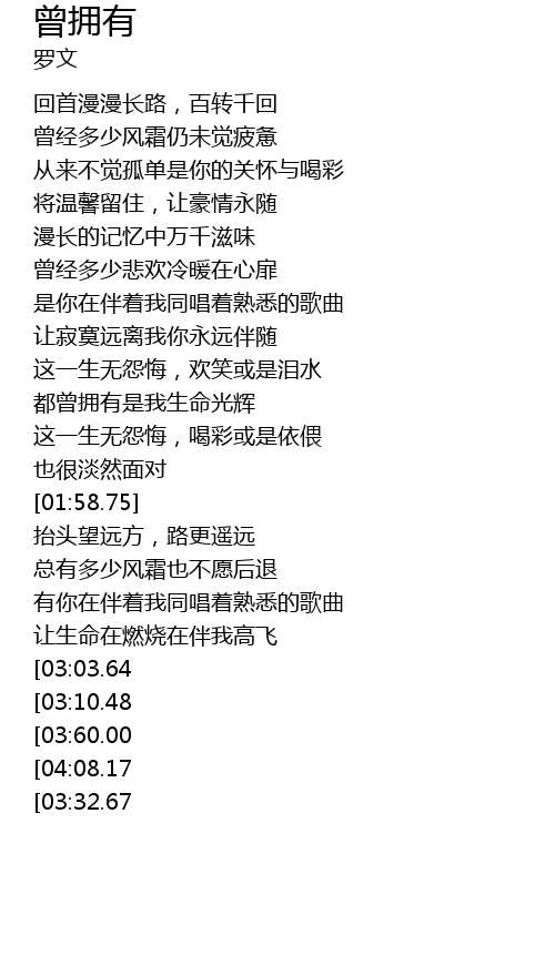 | [03:41.99][03:03.64] | 这一生无怨悔,欢笑或是泪水 |