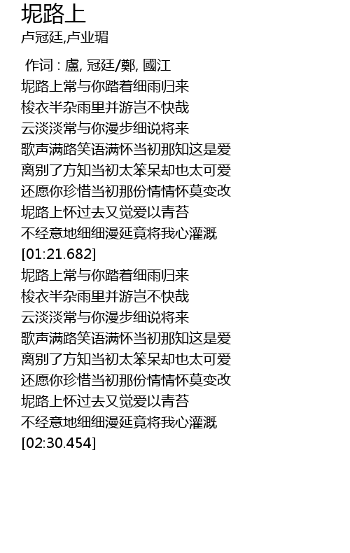 | [01:34.685] | 坭路上常与你踏着细雨归来 |