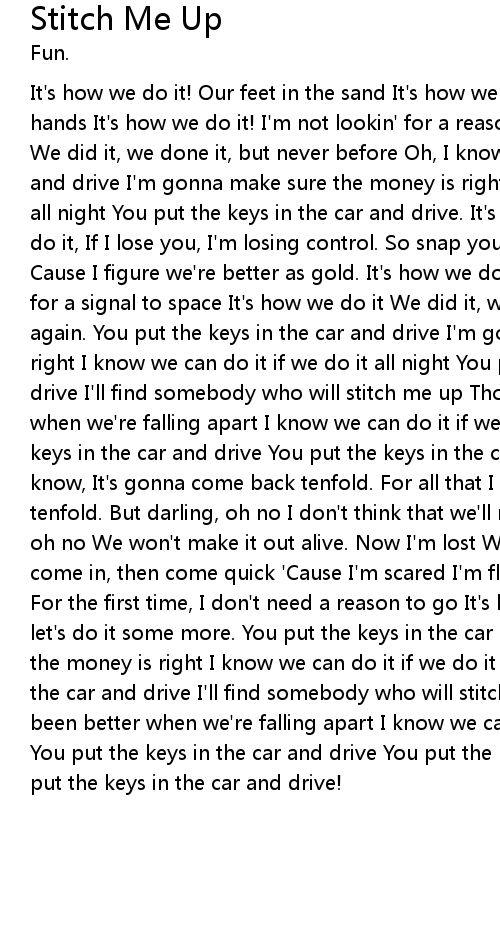 It's how we do it! Our feet in the sand It's how we do it! Our heads in our hands It's how we do it! I'm not lookin' for a reason to go It's how we do it! We did it, we done it, but never before Oh, I know You put the keys in the car and drive I'm gonna make sure the money is right I know we can do it if we do it all night You put the keys in the car and drive. It's how we do it! It's how we do it, If I lose you, I'm losing control. So snap your fingers, pull the trigger Cause I figure we're better as gold. It's how we do it On a sattelite, lookin' for a signal to space It's how we do it We did it, we done it, let's do it again. You put the keys in the car and drive I'm gonna make sure the money is right I know we can do it if we do it all night You put the keys in the car and drive I'll find somebody who will stitch me up Though I've never been better when we're falling apart I know we can do it if we do it all night You put the keys in the car and drive You put the keys in the car and drive. For all that I know, It's gonna come back tenfold. For all that I know, It's gonna come back tenfold. But darling, oh no I don't think that we'll make it out alive Darling, oh no We won't make it out alive. Now I'm lost With each passing day So if you come in, then come quick 'Cause I'm scared I'm floating away. It's how we do it For the first time, I don't need a reason to go It's how we do it, We done it, let's do it some more. You put the keys in the car and drive I'm gonna make sure the money is right I know we can do it if we do it all night You put the keys in the car and drive I'll find somebody who will stitch me up Though I've never been better when we're falling apart I know we can do it if we do it all night You put the keys in the car and drive You put the keys in the car and drive You put the keys in the car and drive! |