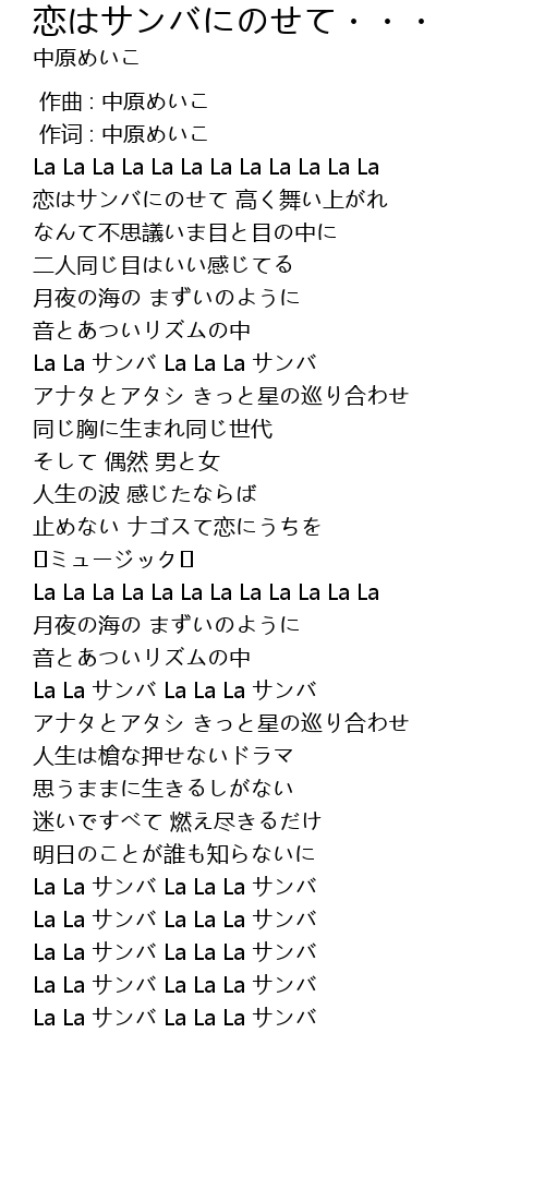 | [00:34.31] | 恋はサンバにのせて 高く舞い上がれ |