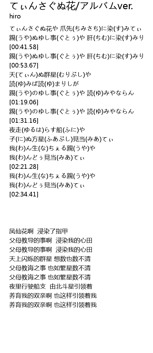 | [00:17.42] | てぃんさぐぬ花や 爪先(ちみさち)に染(す)みてぃ |