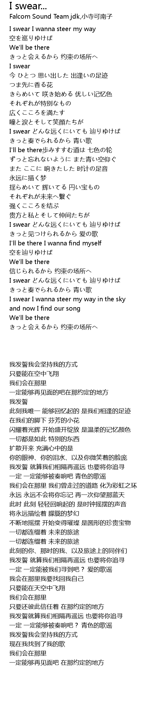 | [01:41.010] | I swear どんな远くにいても 辿りゆけば |