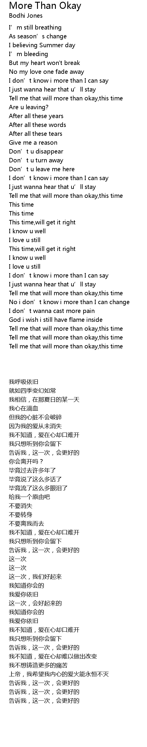 | [00:46.100] | Tell me that will more than okay,this time |
