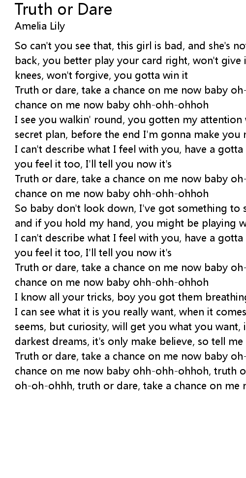 Truth or dare, take a chance on me now baby oh-oh-ohhh, truth or dare, take a chance on me now baby ohh-ohh-ohhoh |
