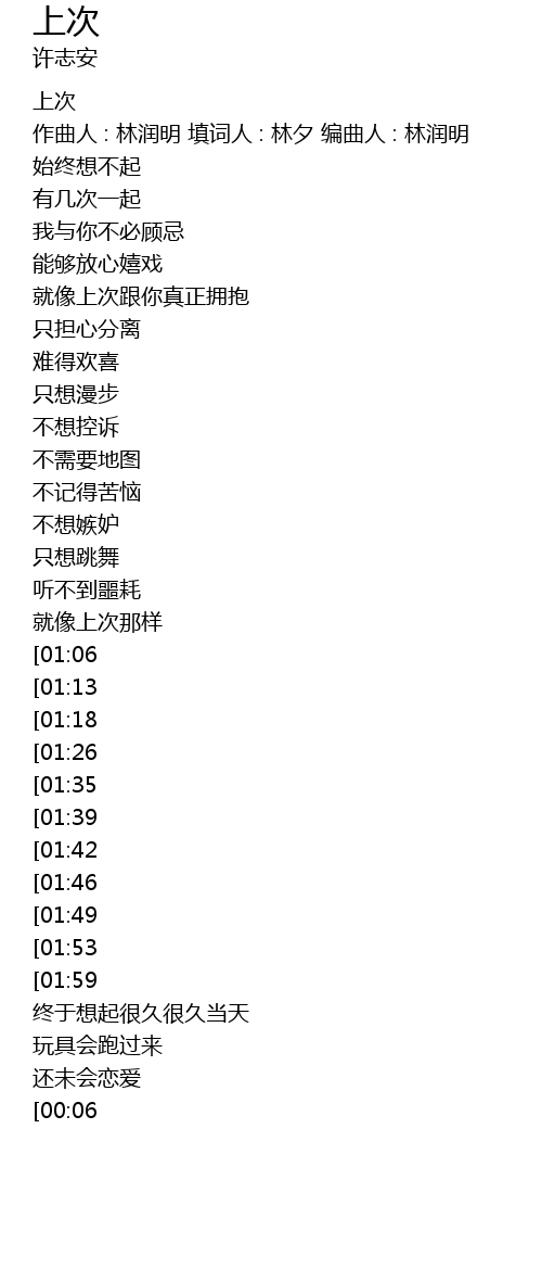 | [00:03] | 作曲人 : 林润明 填词人 : 林夕 编曲人 : 林润明 |