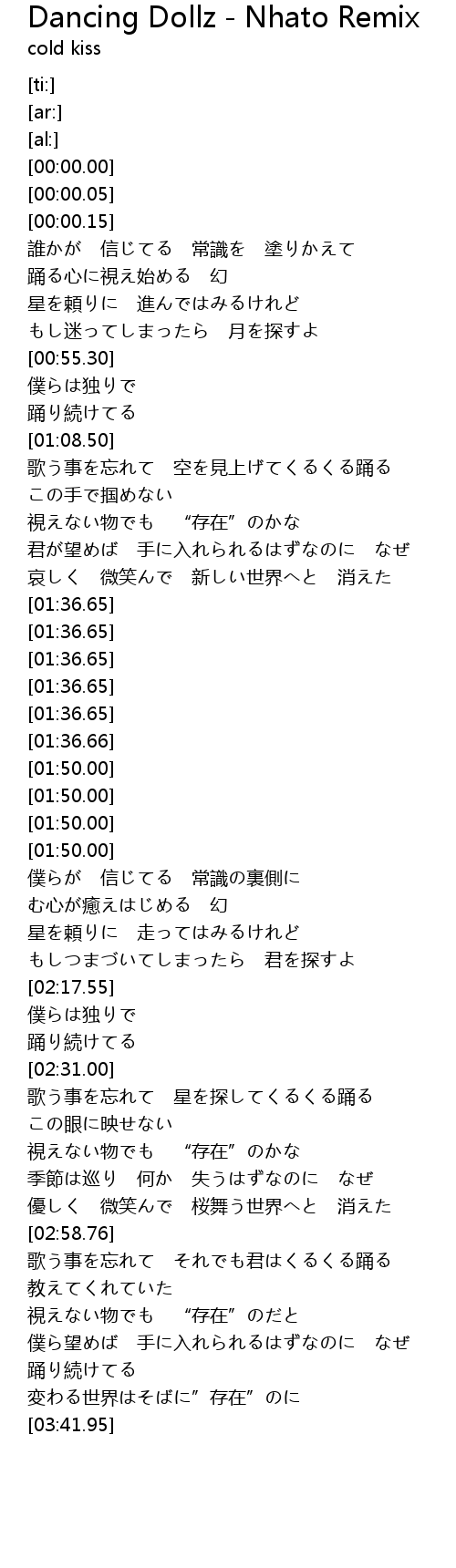 | [03:13.70] | 歌う事を忘れて それでも君はくるくる踊る |