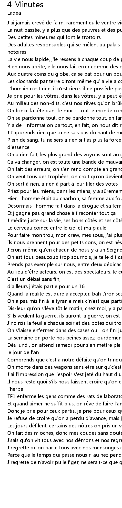 | Plein de sang, tu ne sers à rien si t' as plus la force de mettre un plein d' essence | |