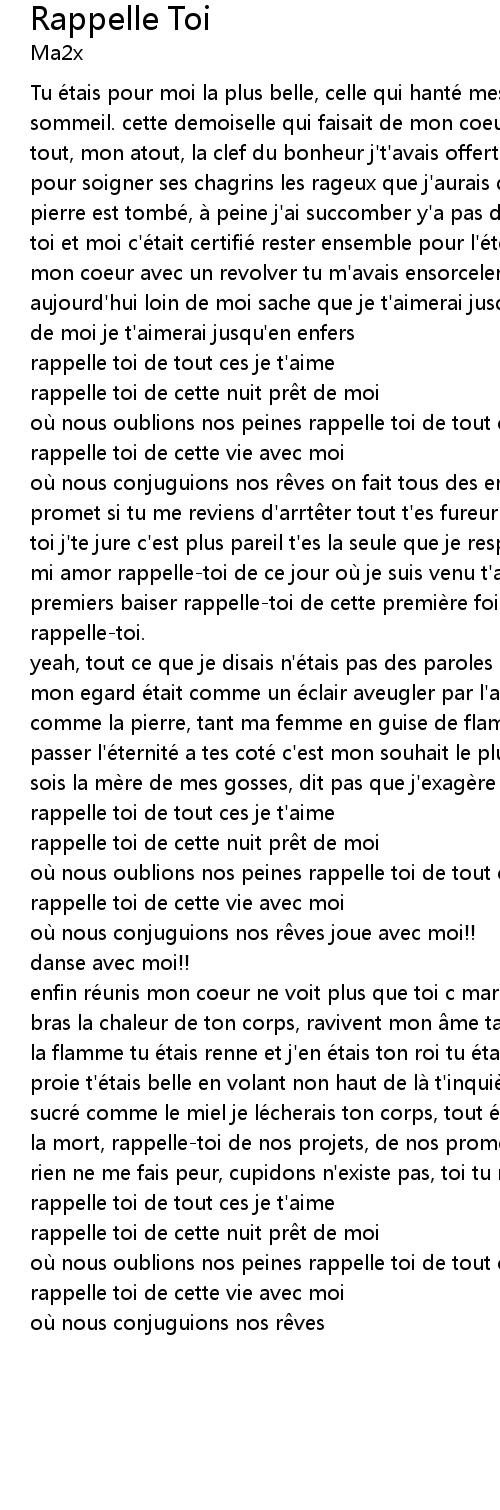 | ou nous conjuguions nos r ves on fait tous des erreurs pardonnes moi j' te promet si tu me reviens d' arrt ter tout t' es fureur je perd mes repe re loin de toi j' te jure c' est plus pareil t' es la seule que je respectais comme ma me re mi amor rappelletoi de ce jour ou je suis venu t' aborder rappelletoi de nos premiers baiser rappelletoi de cette premie re fois | |