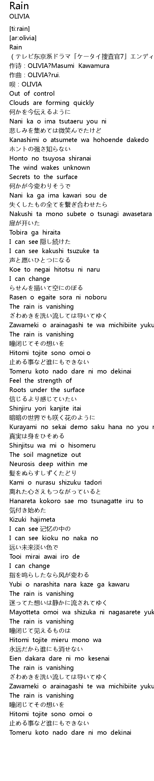 | [00:01.50] | Rain (テレビ东京系ドラマ「ケータイ捜査官7」エンディングテーマ曲) |