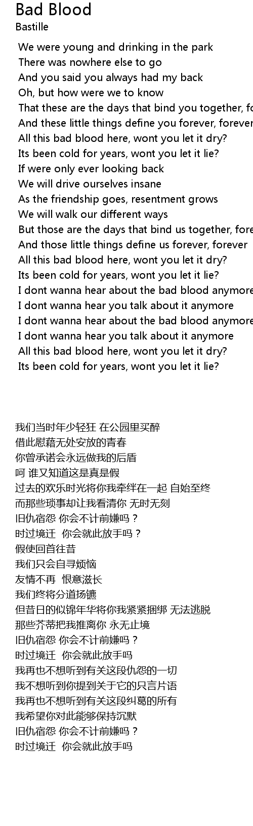 | [02:20.49] | I dont wanna hear about the bad blood anymore |