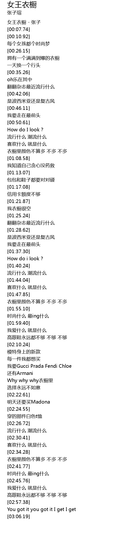 | [02:15.30] | wo yao Gucci Prada Fendi Chloe |