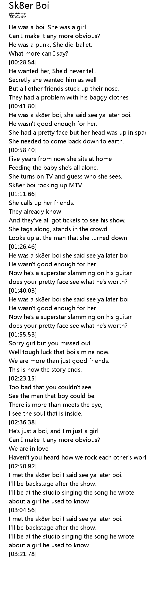 | [03:04.96] | I met the sk8er boi I said see ya later boi. |