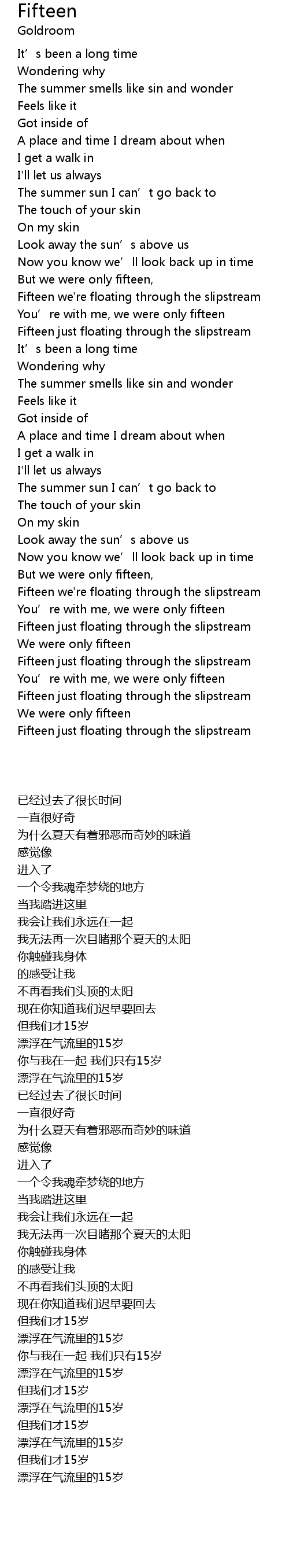 | [01:34.78] | Fifteen we're floating through the slipstream |