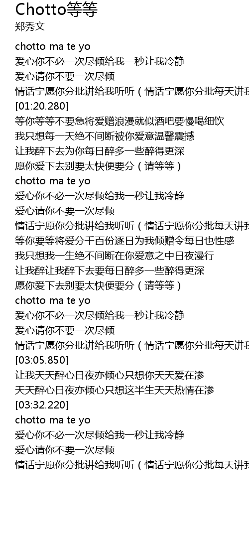 | [01:11.530] | 情话宁愿你分批讲给我听听(情话宁愿你分批每天讲我听听) |