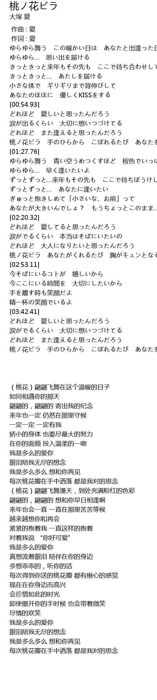 | [04:04.23] | 桃ノ花ビラ 手のひらから こぼれるたび あなたを感じるの |