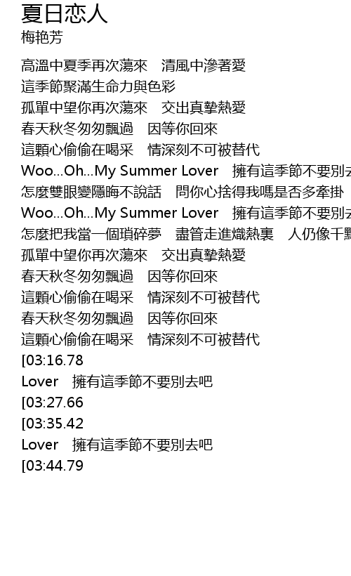 | [04:11.67][03:35.42][02:26.61] | Woo...Oh...My Summer Lover 擁有這季節不要別去吧 |