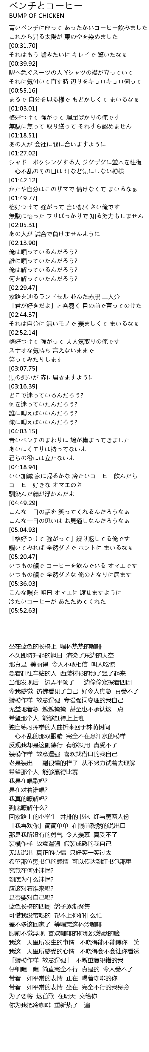 | [00:16.97] | 青いベンチに座って あったかいコーヒー飲みました |