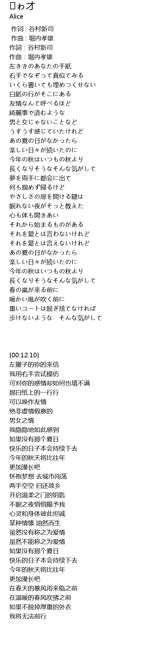 | [00:12.10] | 作詞:谷村新司 |