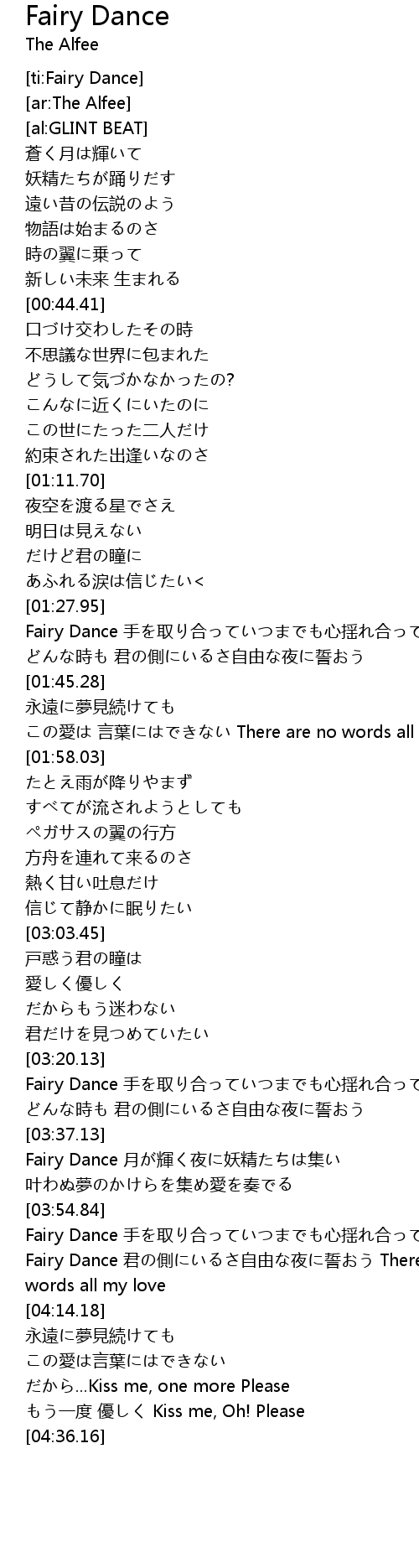 | [04:03.92] | Fairy Dance 君の側にいるさ自由な夜に誓おう There are no words all my love |