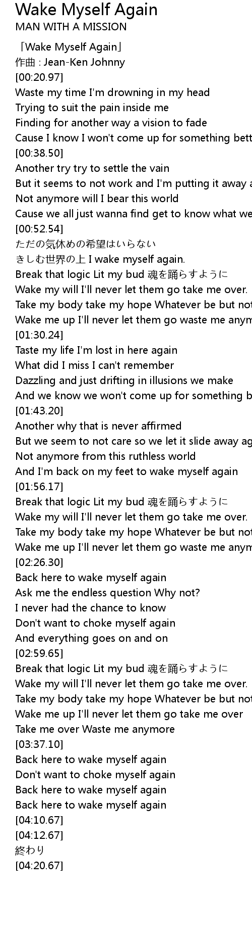 | [01:00.37] | きしむ世界の上 I wake myself again. |