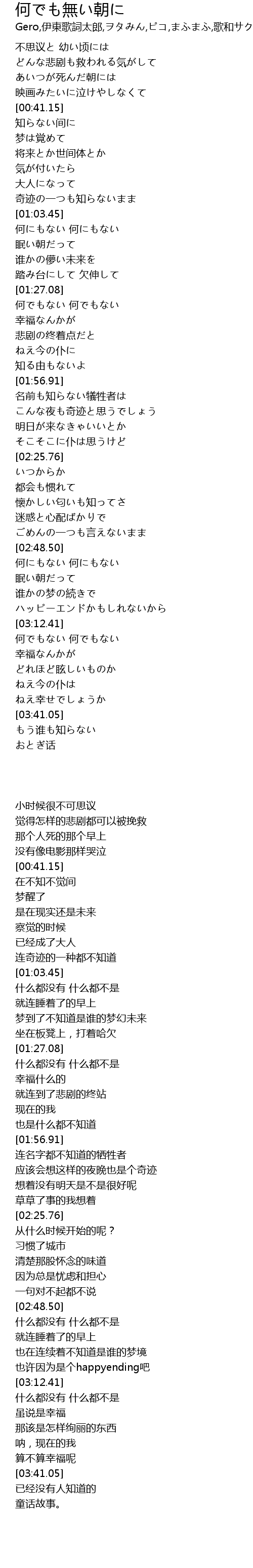| [00:59.53] | 奇迹の一つも知らないまま |