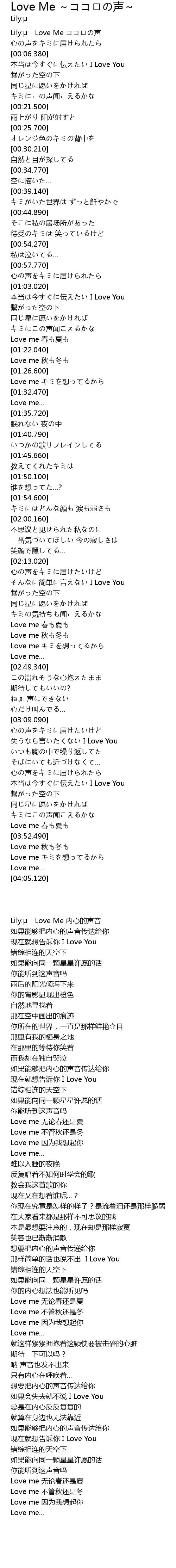 | [00:00.250] | Lily.μ - Love Me ココロの声 |