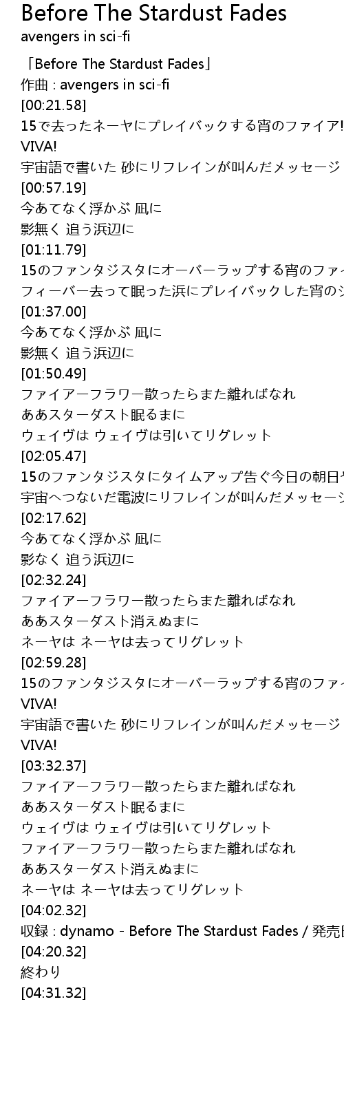 | [04:17.32] | shōu lù dynamo Before The Stardust Fades fā mài rì 2010 10 20 |