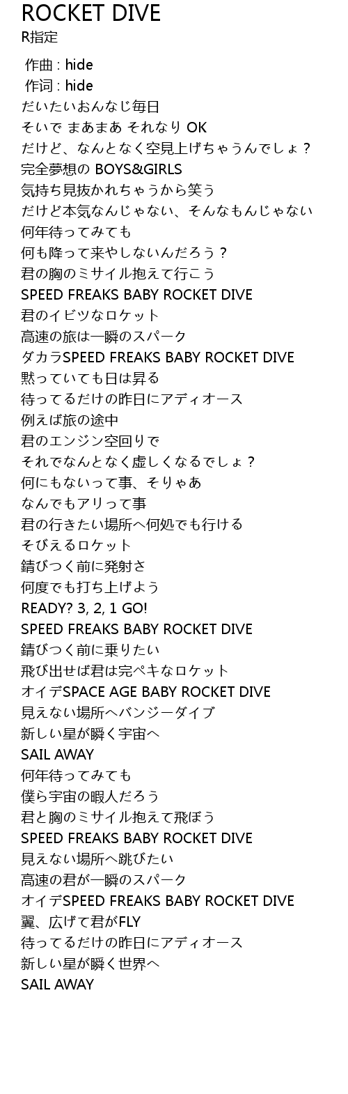 | [03:04.81] | オイデSPEED FREAKS BABY ROCKET DIVE |