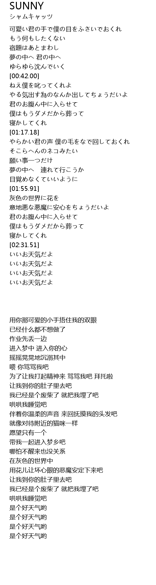 | [00:09.47] | 可愛い君の手で僕の目をふさいでおくれ |