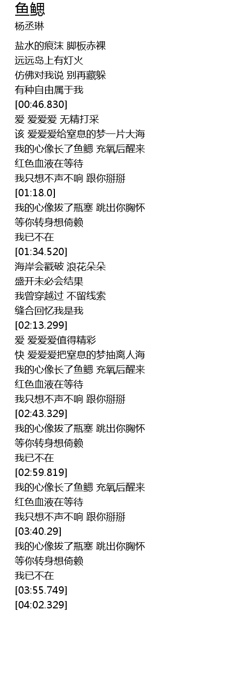 | [02:29.499] | 我的心像长了鱼鳃 充氧后醒来 |