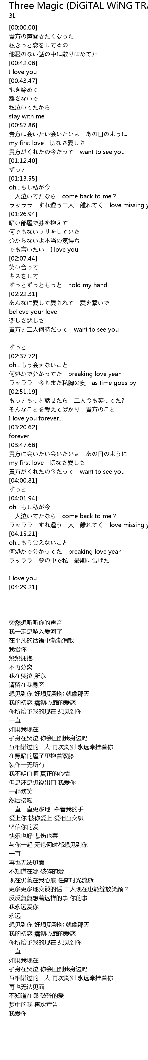 | [04:08.71] | ラッララ すれ違う二人 離れてく love missing you |