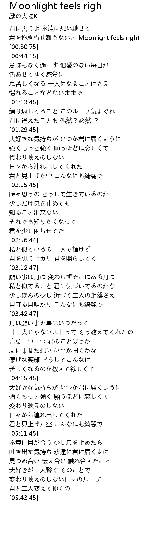 | [00:22.24] | 君を抱き寄せ離さないと Moonlight feels right |