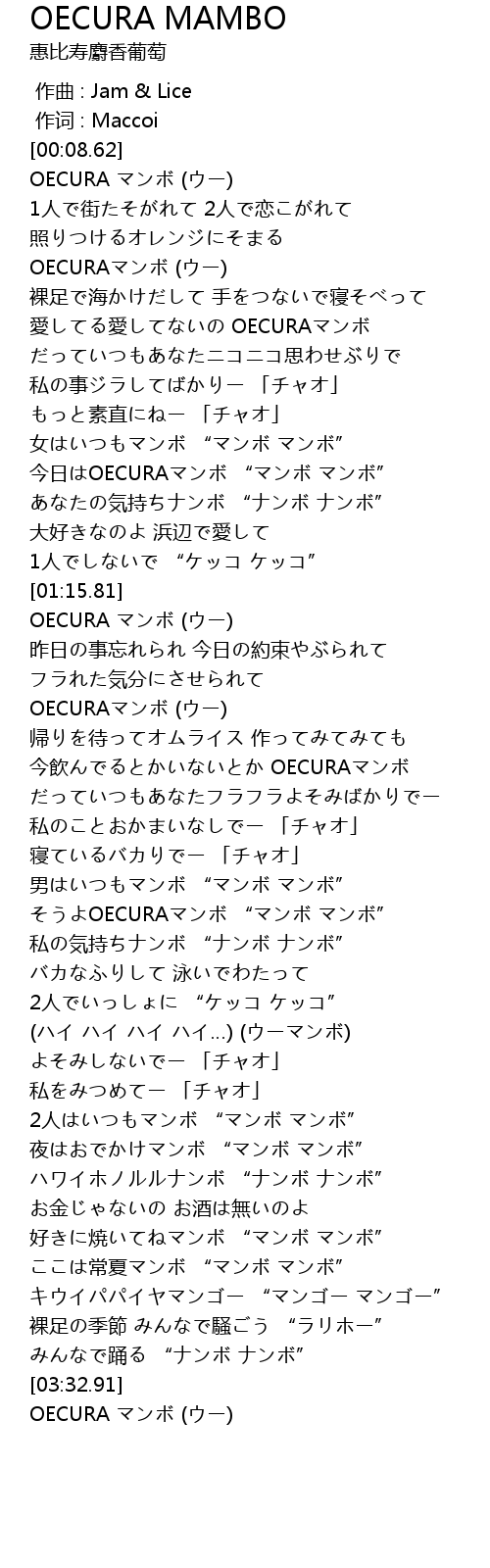 | [00:34.49] | 愛してる愛してないの OECURAマンボ |