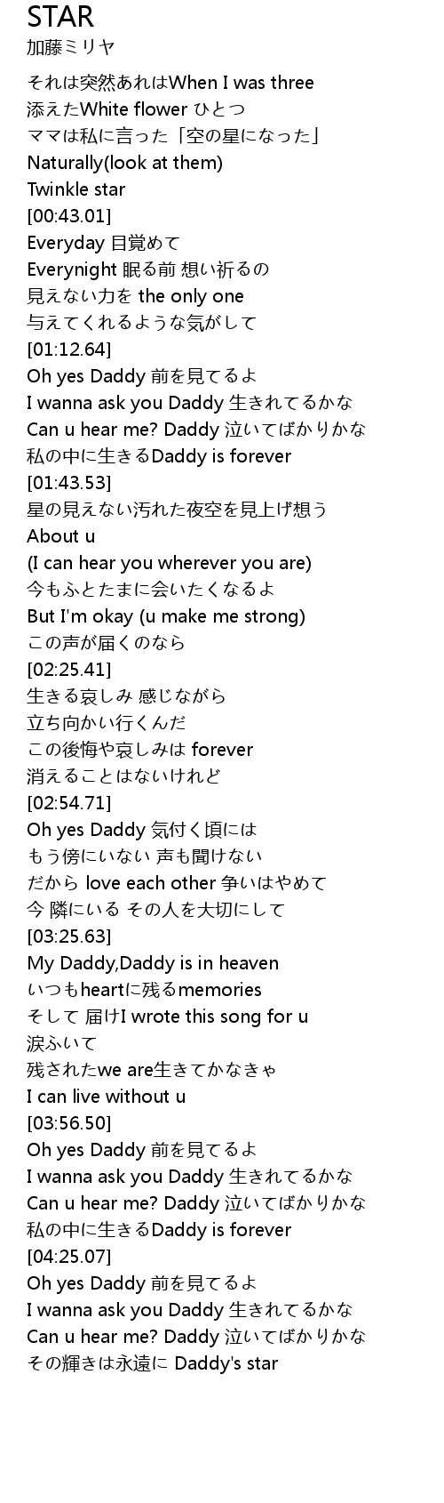 | [04:32.28] | I wanna ask you Daddy 生きれてるかな |
