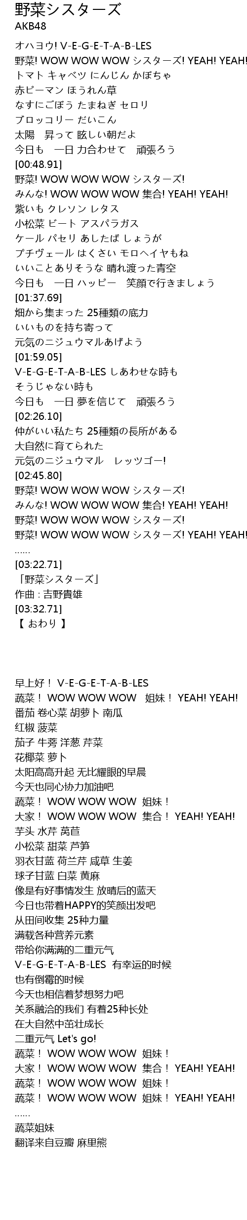 | [03:10.53] | 野菜! WOW WOW WOW シスターズ! YEAH! YEAH! |