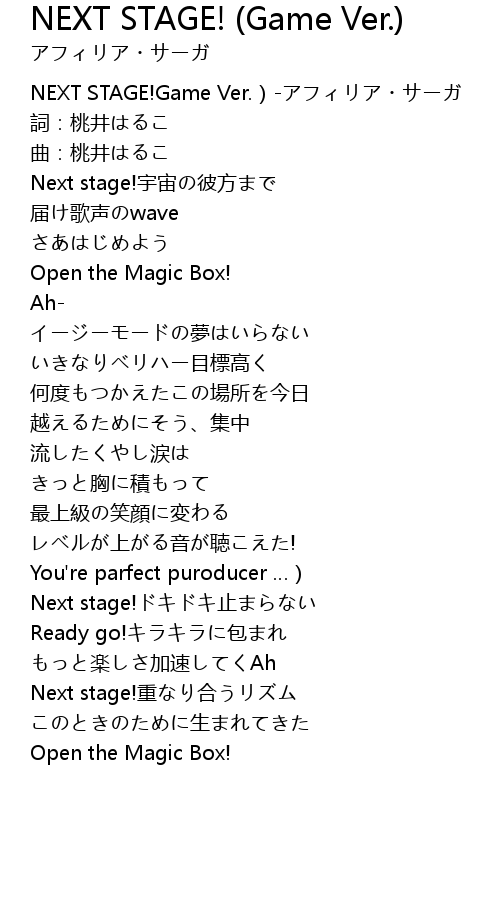 | [00:00.390] | NEXT STAGE!Game Ver.)-アフィリア・サーガ |