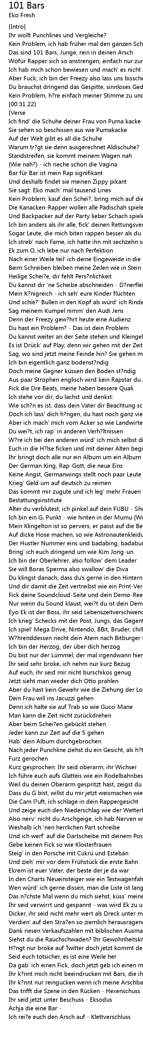 | [00:17.00] | Das sind 101 Bars, Junge, rein in deinen Arsch |