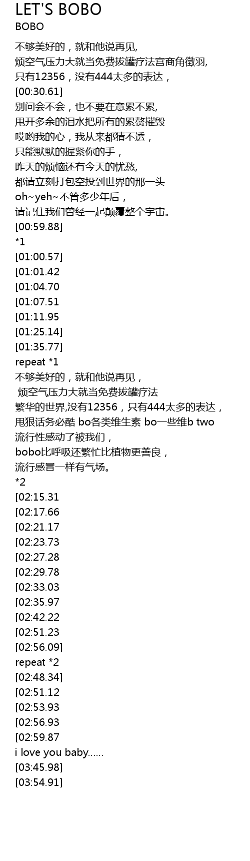 | [03:20.73][02:33.03] | let's bobo! 来次bobo! 再次bobo! |