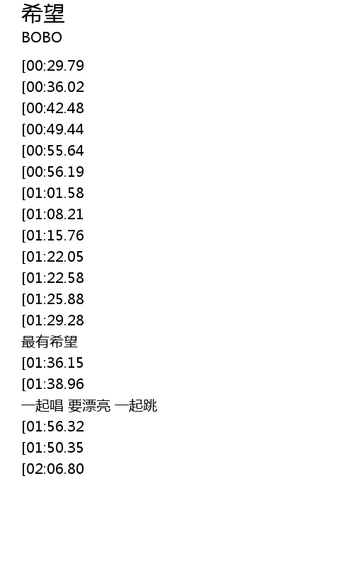 | [03:29.30][01:56.32][01:43.16] | 一起唱 要漂亮 一起跳 要飞翔 |